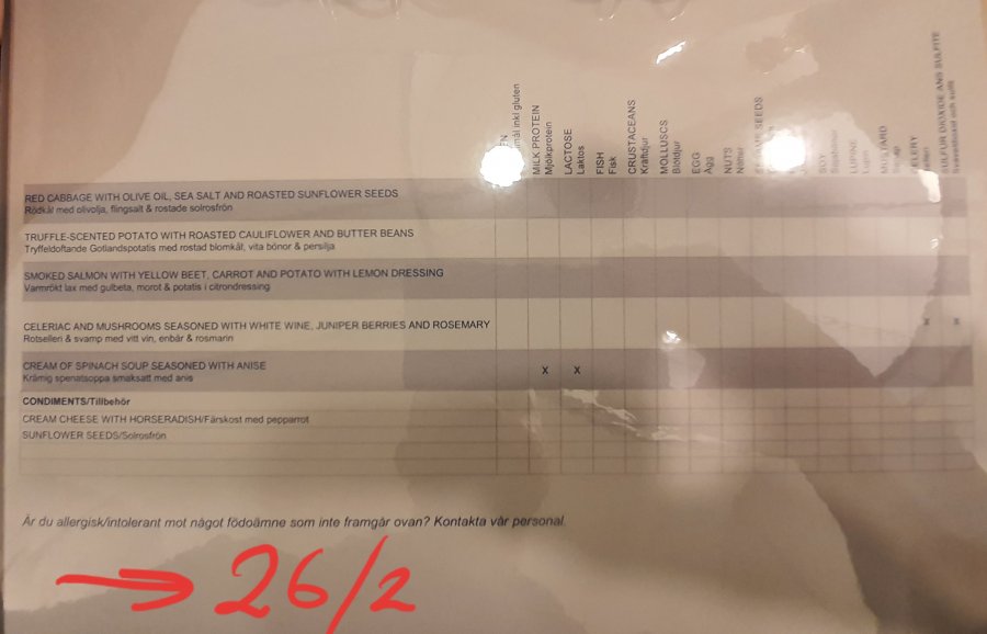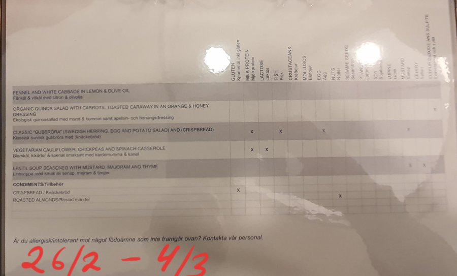 Oj, bjuder SAS på mat som faktiskt har 100% skandinaviskt ursprung?Idag riktigt gott. Janssons Frestelse, Pumpasoppa och en sjukt god kall pasta med mör kyckling. Något har hänt med utbudet till det bättre. Till och med krutongerna har fått sig ett lyft, rustika med balndning av både mörkt och ljust bröd.
