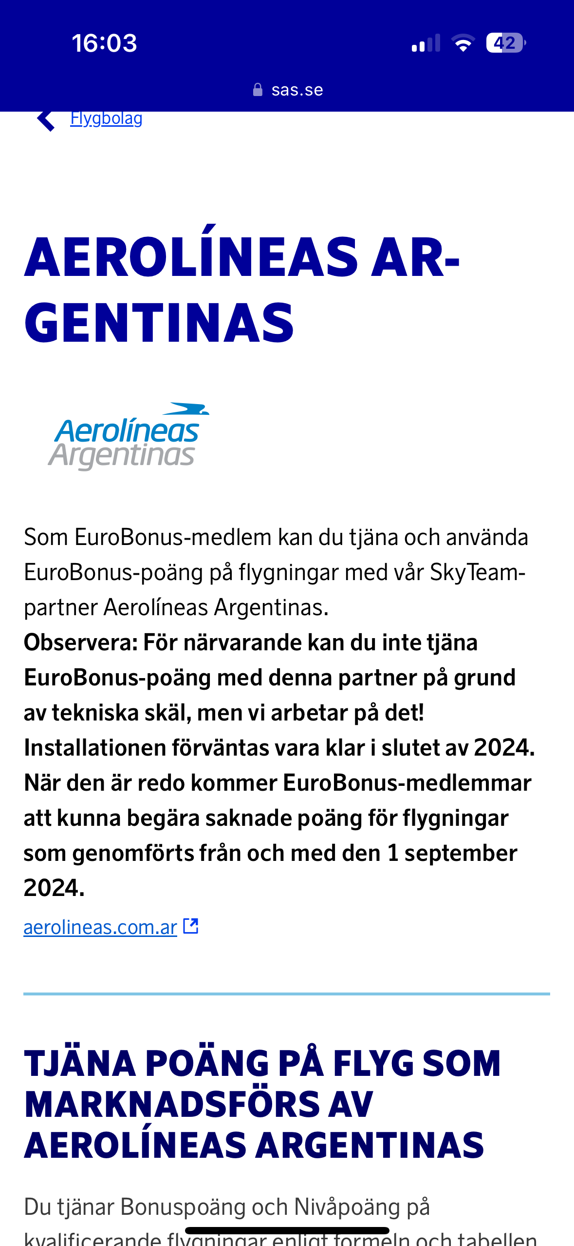 Observera: För närvarande kan du inte tjäna EuroBonus-poäng med denna partner på grund av tekniska skäl, men vi arbetar på det! Installationen förväntas vara klar i slutet av 2024. När den är redo kommer EuroBonus-medlemmar att kunna begära saknade poäng för flygningar som genomförts från och med den 1 september 2024.