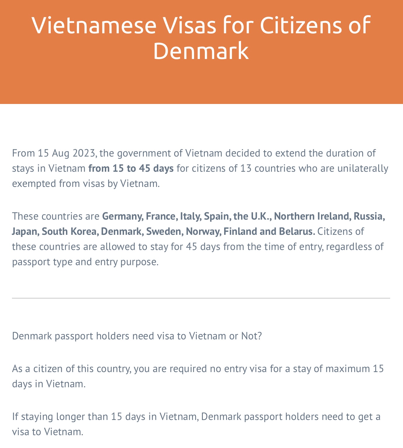Er det korrekt forstået at man blot møder op med sit pas? Siden der er lidt tvetydig - først skriver de "From 15 Aug 2023, the government of Vietnam decided to extend the duration of stays in Vietnam from 15 to 45 days for citizens of 13 countries who are unilaterally exempted from visas by Vietnam. These countries are Germany, France, Italy, Spain, the U.K., Northern Ireland, Russia, Japan, South Korea, Denmark, Sweden, Norway, Finland and Belarus. Citizens of these countries are allowed to stay for 45 days from the time of entry, regardless of passport type and entry purpose."