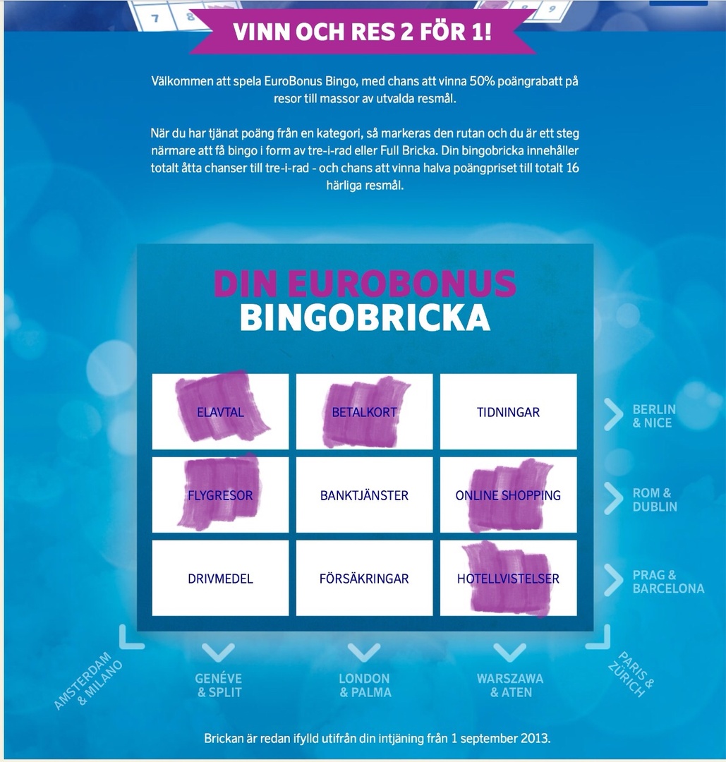 Vid bingo får du ett vinstmejl från oss några dagar efter att poängen syns på ditt konto. 30 dagar efter att du fått mejlet, så kan du boka en resa med SAS till de utvalda resmålen med 50% poängrabatt*, dock tidigast 1 september 2014. Du kan boka och resa med SAS till och med 31 augusti 2015. Tänk på att vara inloggad på dina EuroBonus-sidor när du bokar, så dras rabatten automatiskt! Barn under 12 år får ytterligare 50% poängrabatt*.