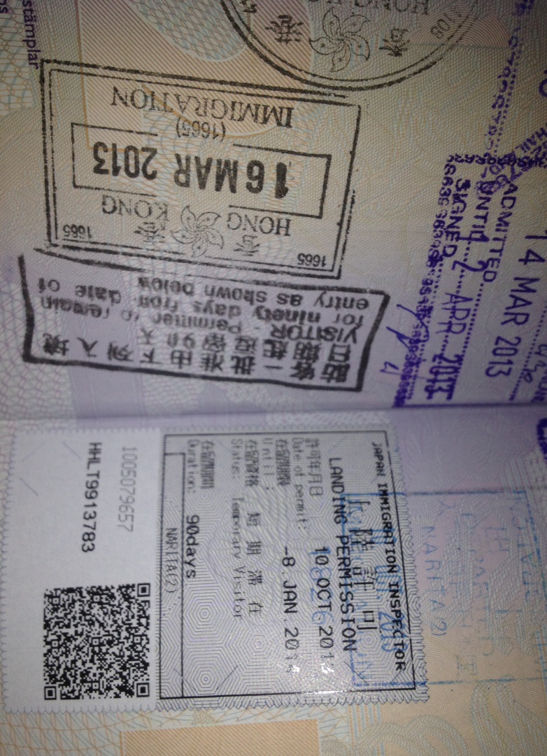 Hongkong mars 2013 (stämpel) och Japan oktober 2013 (fastklistrad lapp, departure card häftades dock fast).