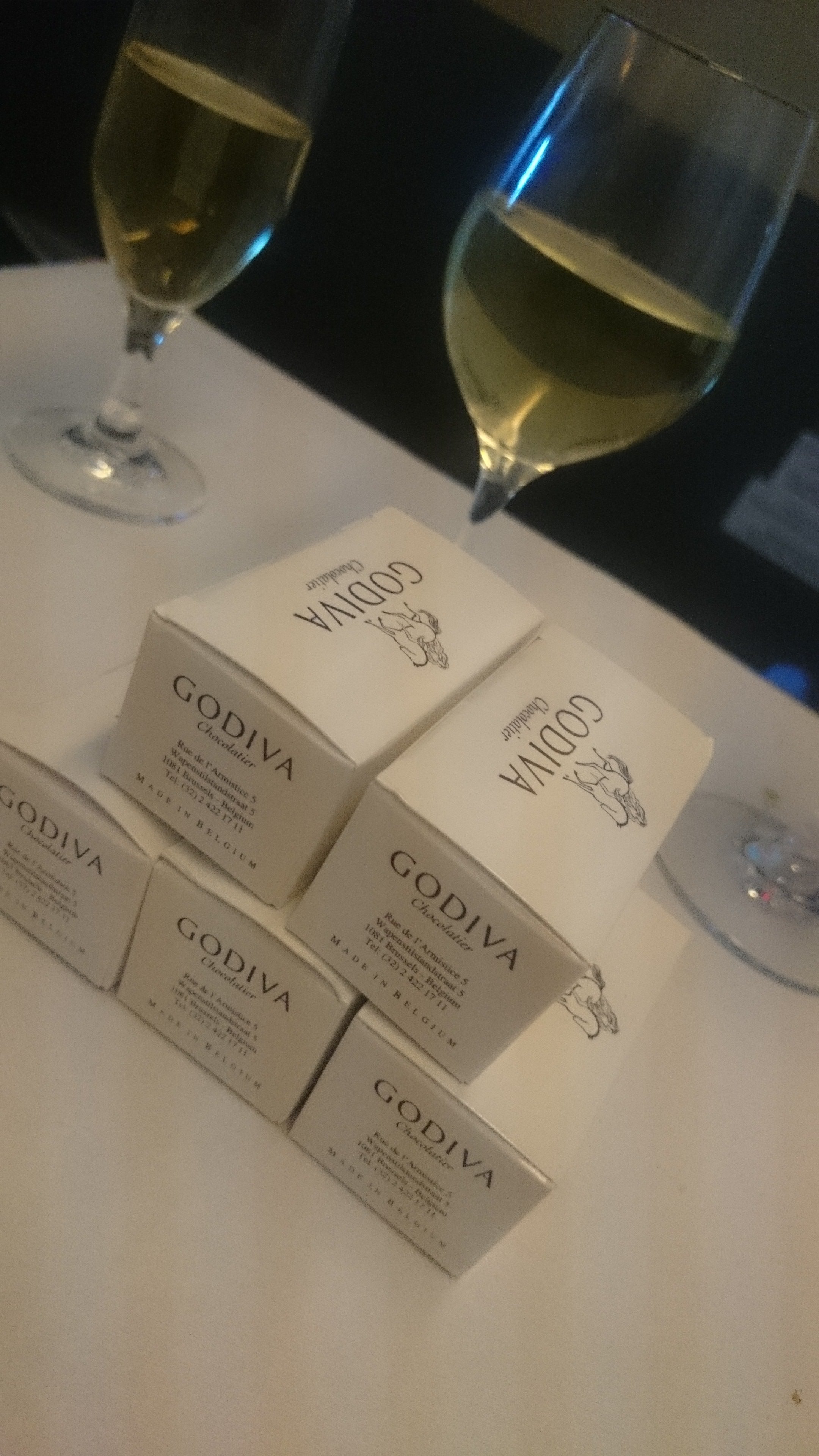 Vi får snabbt frågan om vi vill ha något att dricka och beställer in varsitt glas champagne och lite varma nötter.