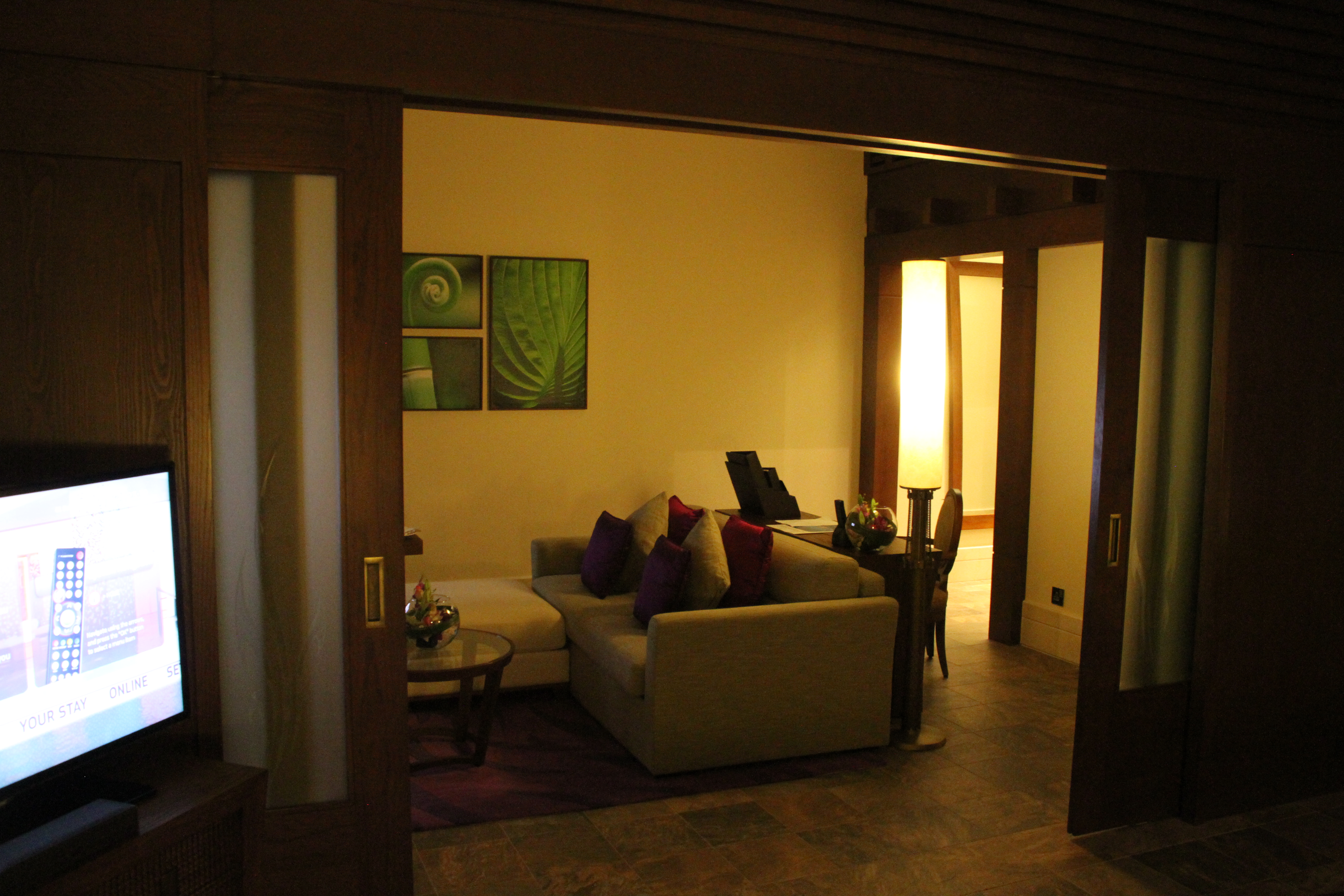 Vi checkas in och får all info om dom olika faciliteterna och öppetider. När vi blivit incheckade kommer 2 kvinnliga anställda ut med ett glas juice och en kall handduk och vi blir även presenterade för vår butler. Han visar oss ut genom entrén igen och en väntande golfbil. Vi blir körda i denna golfbil till vår separata byggnad där vår svit är beläggen.