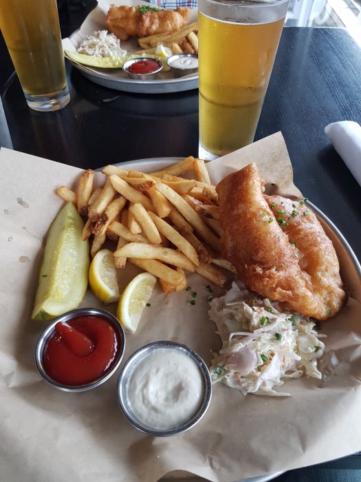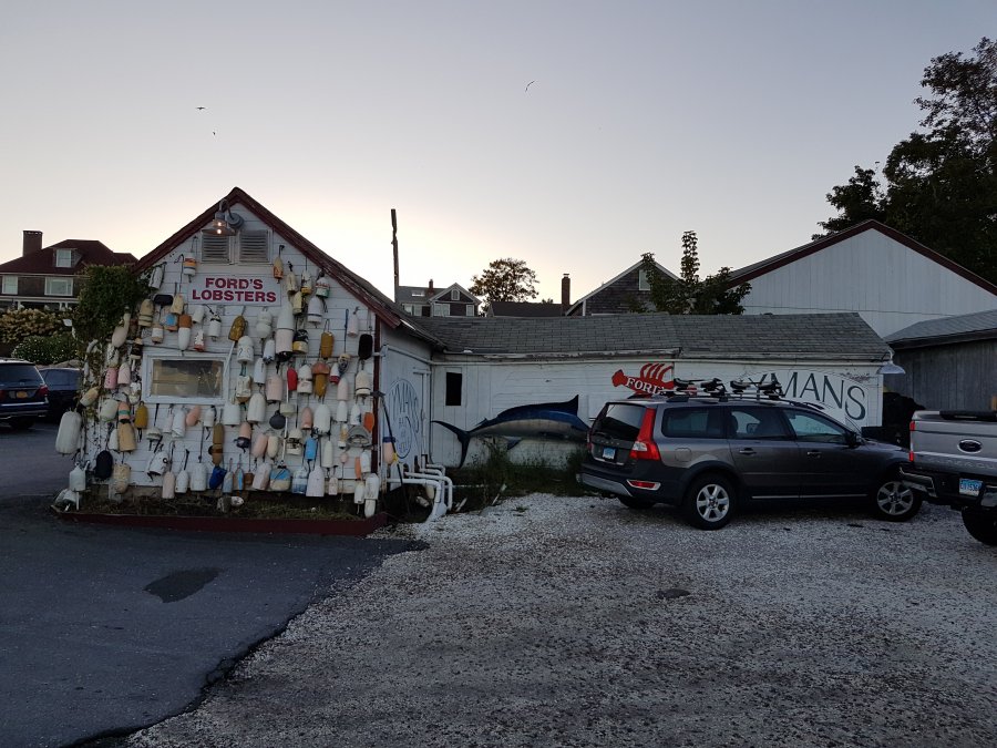 Bredvid oss på bryggeriet var ett äldre par, inget vi la märke till förrän vid nästa stopp. Vi bilade ner till New London vid kusten för att leta efter en hummer-restaurang för middag. När vi kom till Noank så hittade vi några hummerhak på google maps och tog första vi passerade, Ford's Lobsters. Det var ca 20 minuter kö för oss att få bord strax innan 17 och bredvid oss hamnade paret vi träffat på bryggeriet innan och de undrade om vi var de där 3 grabbarna från bryggeriet. Vad är oddsen för att man hamnar på samma bryggeri och restaurang soml igger drygt 3 mil från varandra? Tydligen så var detta ett känt ställe och det var 3e gången i år de åkt dit, en resa på över 10 mil enkel från deras hem.